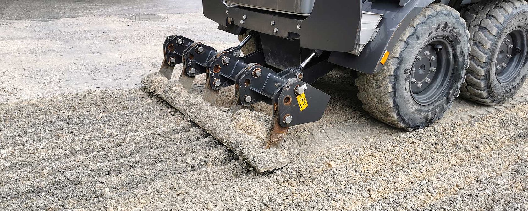 Um jedoch die wasserundurchlässige, wannenartige Struktur dieser Schadstellen nachhaltig zu durchbrechen, ist zuvor der Einsatz eines Aufreißgeräts empfehlenswert – etwa eines Graders mit Rundschaftmeißeln oder vergleichbarer Technik. Damit wird die bestehende Oberfläche effektiv aufgerissen und gleichzeitig durchmischt.